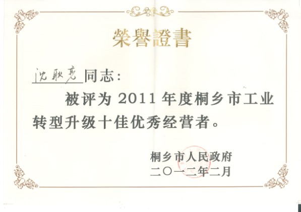 會(huì)上公布了2011年度表彰名單,我公司被評(píng)為“2011年度桐鄉(xiāng)市工業(yè)轉(zhuǎn)型升級(jí)十大突出貢獻(xiàn)企業(yè)”、“國(guó)家級(jí)安全生產(chǎn)標(biāo)準(zhǔn)化企業(yè)”。公司下屬子公司桐鄉(xiāng)上升膠帶有限公司被評(píng)為“2011年度桐鄉(xiāng)市出口十強(qiáng)企業(yè)”。同時(shí),公司董事長(zhǎng)沈耿亮榮獲“2011年度桐鄉(xiāng)市工業(yè)轉(zhuǎn)型升級(jí)十大優(yōu)秀經(jīng)營(yíng)者”榮譽(yù)稱號(hào)。