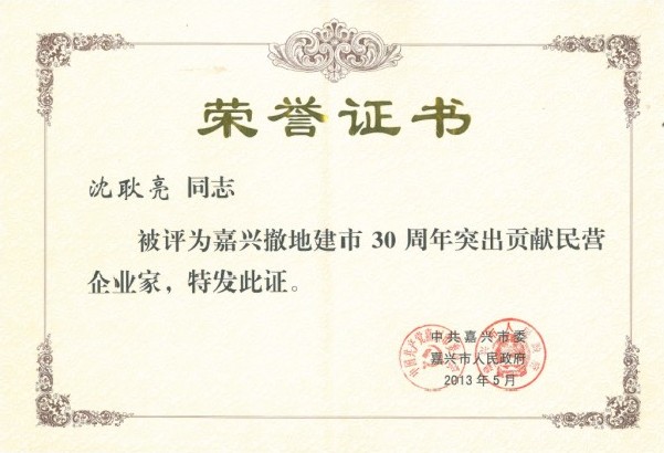 市委副書記高玲慧首先宣讀了市委、市政府《關(guān)于表彰嘉興撤地建市30周年民營企業(yè)發(fā)展先進集團和先進個人的決定》,市四套班子領(lǐng)導為獲獎企業(yè)和個人頒獎。公司董事長沈耿亮被授予“突出貢獻民營企業(yè)家”。